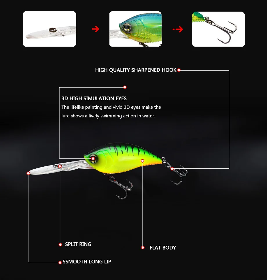 3.The baits have lifelike painting and vivid 3D eyes ,they make the bait looks like real fish swimming in the water during fishing.
