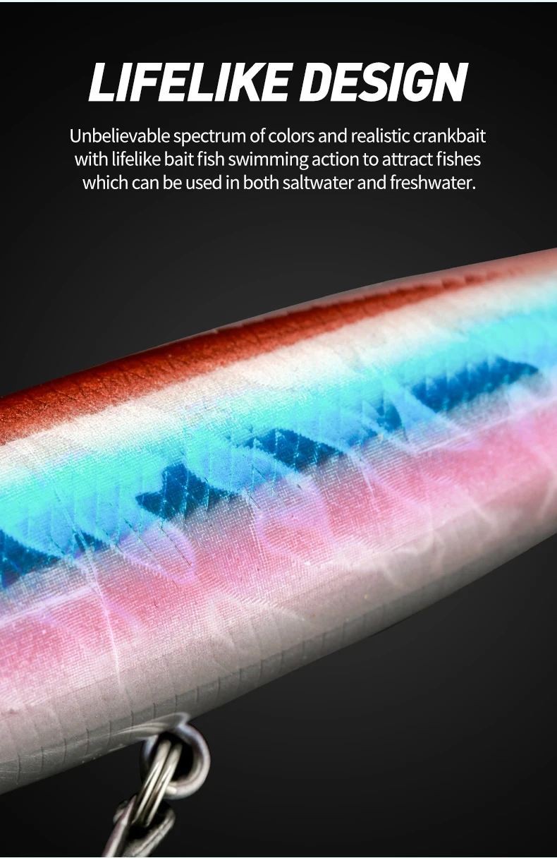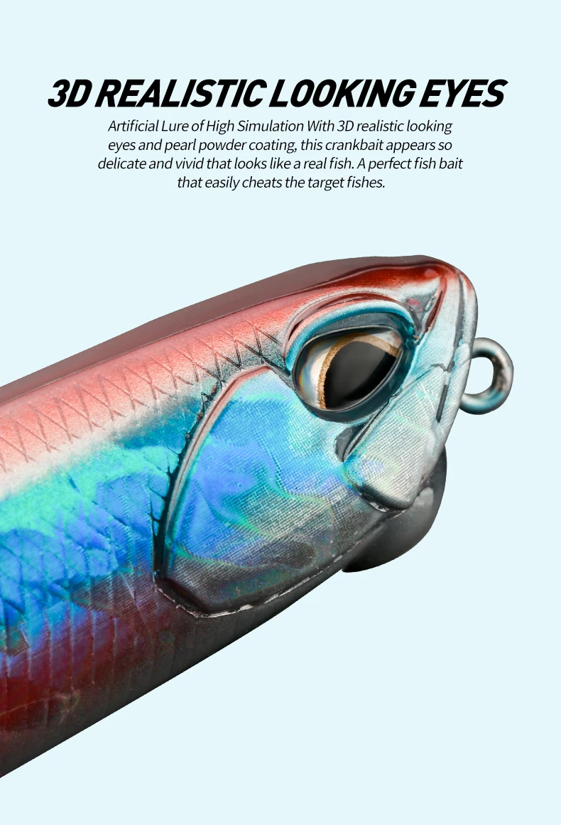 Realistic 3D eyes, natural fish profile, realistic scale with a reflective flashing finish and color changing pattern, 3-fold rendering technology, full color, conspicuous and wear-resistant