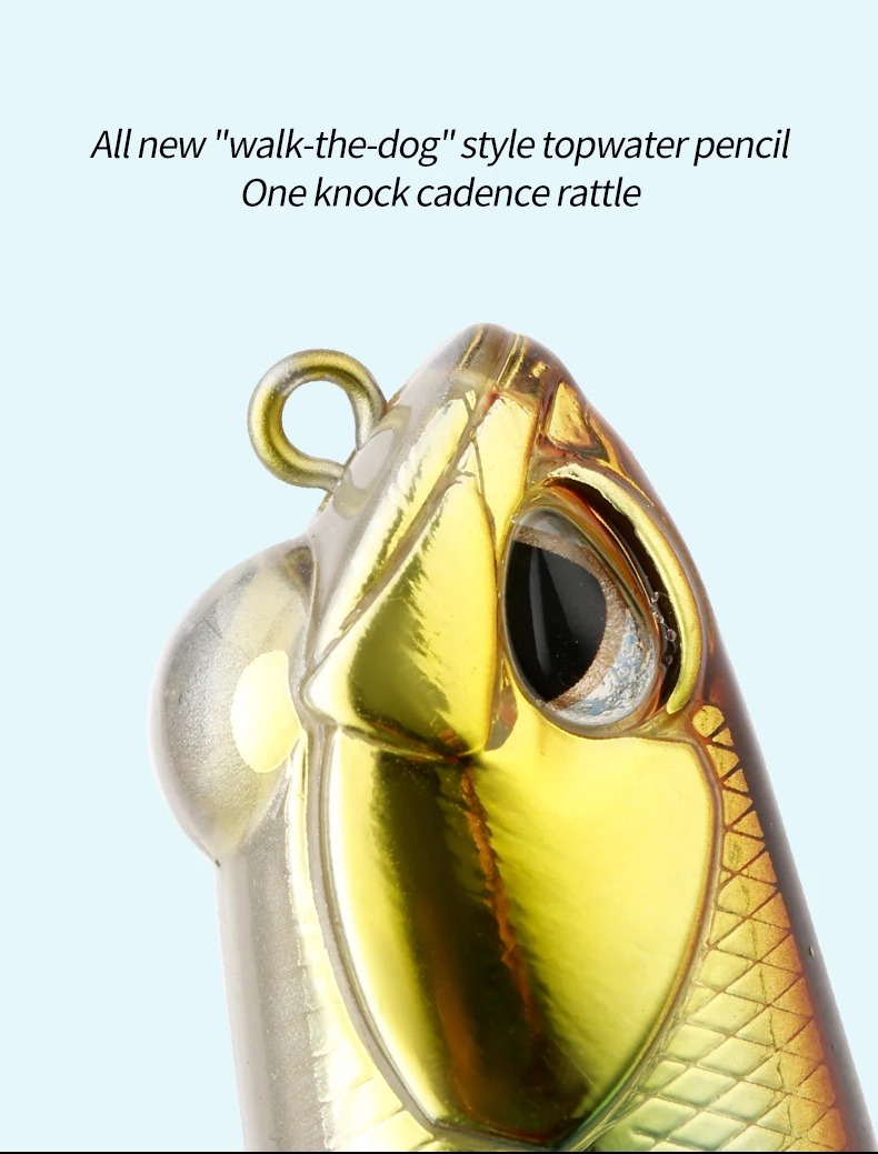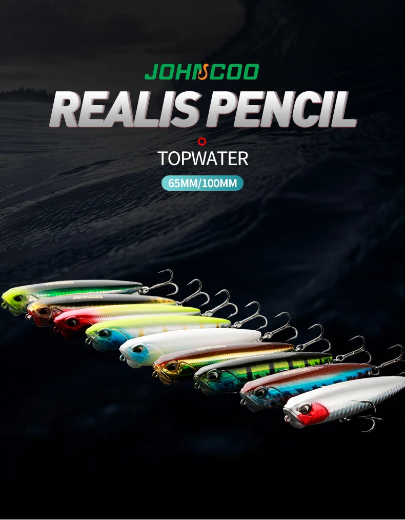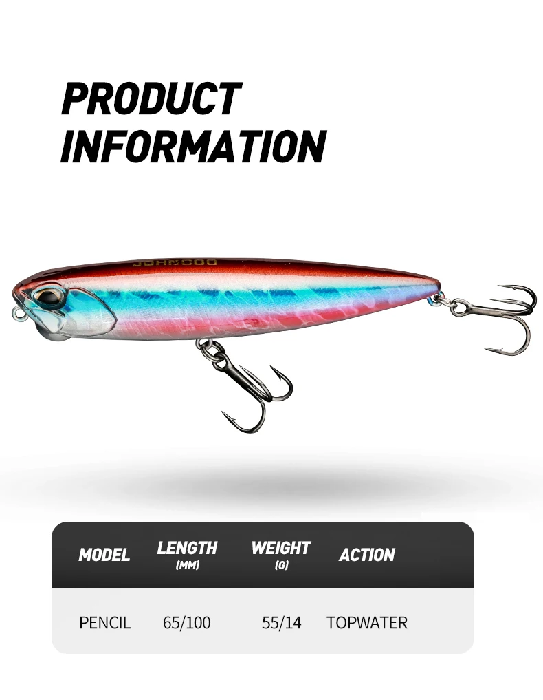 JOHNCOO PENCIL 65mm 100mm Topwater Lure 5.5/14g Swim Crankbait Whopper Artificial Bait Trolling Bass Pike Lure Walk 3D Eye